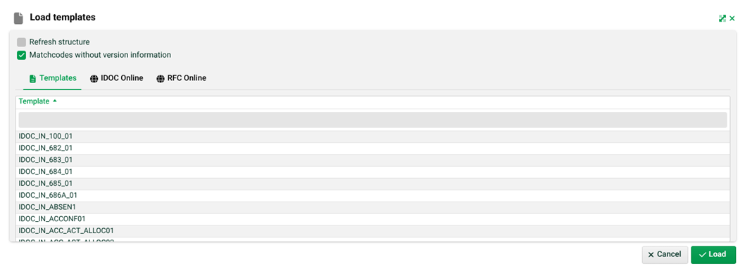 Die folgende Abbildung zeigt den Dialog für das Einlesen einer mitgelieferten IDoc-Vorlage (hier für eine Quellstruktur). Siehe auch Abschnitte Quellstruktur-Menü und Zielstruktur-Menü.