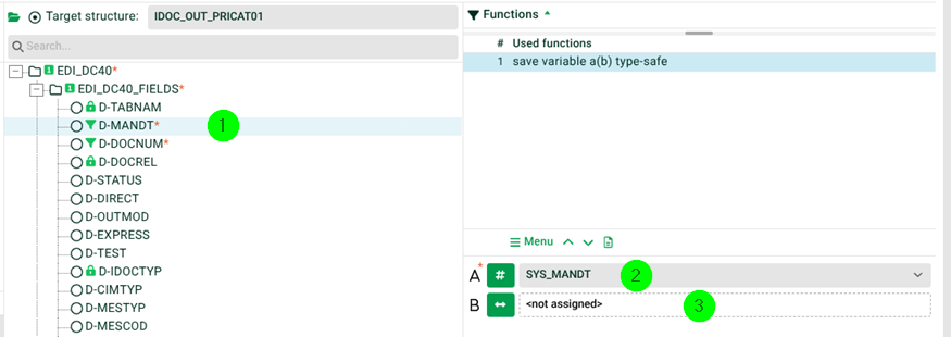 (2) Die Variable SYS_MANDT wird mit dem Wert des zugewiesenen (gemappten) Feldes (3) gefüllt und gleichzeitig wird der Wert in das Feld (1) geschrieben.